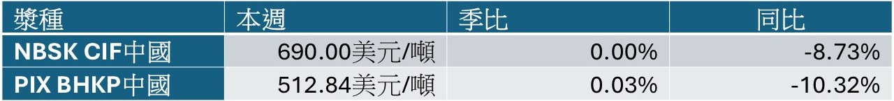 NBSK CIF中國持平於756美元/噸,漂闊漿走低10美元/噸