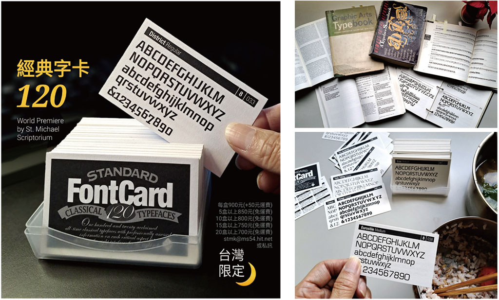 A:我在美國讀書和上班時期就養成隨時隨地識認比對字體的習慣。除了公司和家裡塞滿各造字廠的各式各樣厚厚成冊的字體樣本,我出門時背包裡也都會塞放一、兩本單薄簡便型的字體樣本,方便隨時隨地翻閱比對。回來台灣之後,自己開設計公司,經常要出門接洽設計事務,攜帶厚重或好幾本簡易字體樣本非常不方便,因而心萌製作一套可以簡易查閱比對又可以彈性份量攜帶的字體樣本,這就樣著手規劃設計並印製了名片形式和大小尺寸的《經典字卡》。