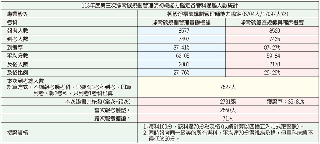 ●表7:113年度第三次iPAS淨零碳規劃管理師鑑定通過人數統計情形