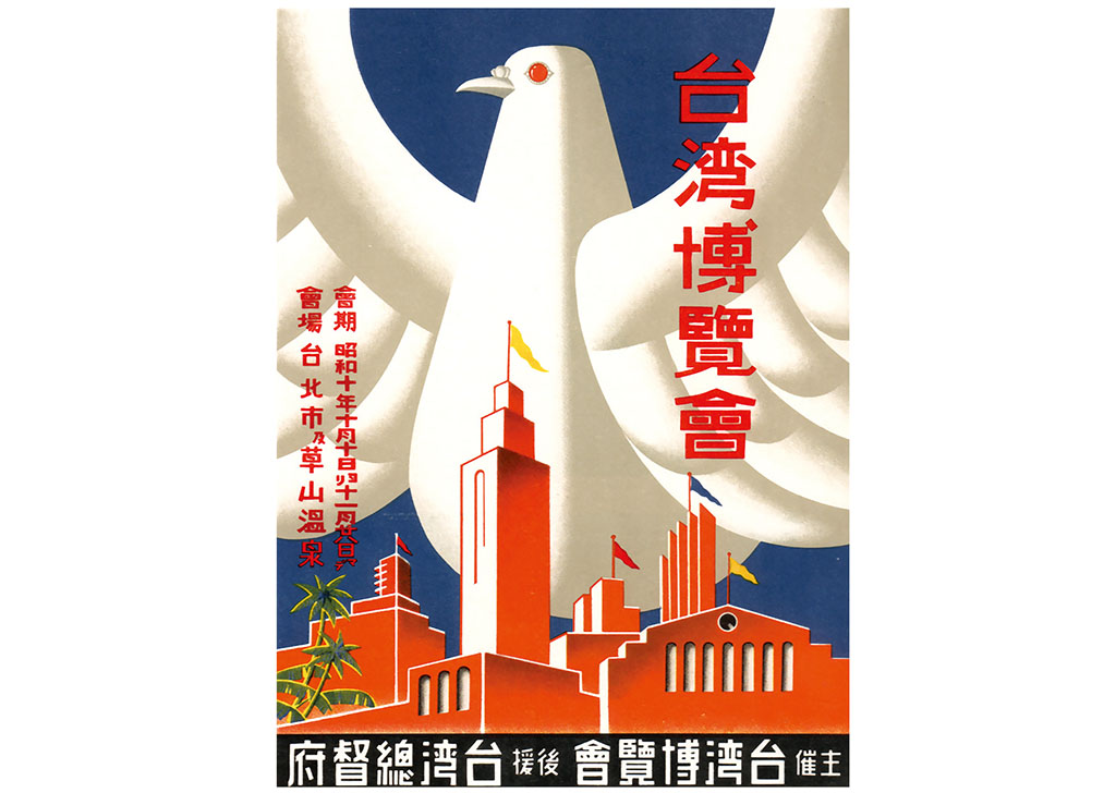 註1︰博覽會標誌╱以台灣總督府原有標誌「台」字外形結合書寫的「博」字為形象應用。註2︰博覽會海報╱第一件宣傳海報以台灣總督府造形結合台灣廟宇和重要經濟產物香蕉為主題形象(主辦單位委由塚本閤治設計)。第二件宣傳海報以展翼和平鴿結合博覽會展館造形為主題形象(邀請比稿,由塚本閤治設計獲選使用)。第三件宣傳海報以有力的手臂撐起光環中的展館為主題形象(公開徵選,由藤佐木繁設計獲選使用)。