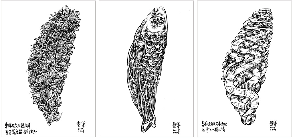 ●圖24:〈台灣練習曲〉系列作品-屏東東港老家黃金葛(左)、台灣櫻花鉤吻鮭(中)、台東九彎十八拐(右)