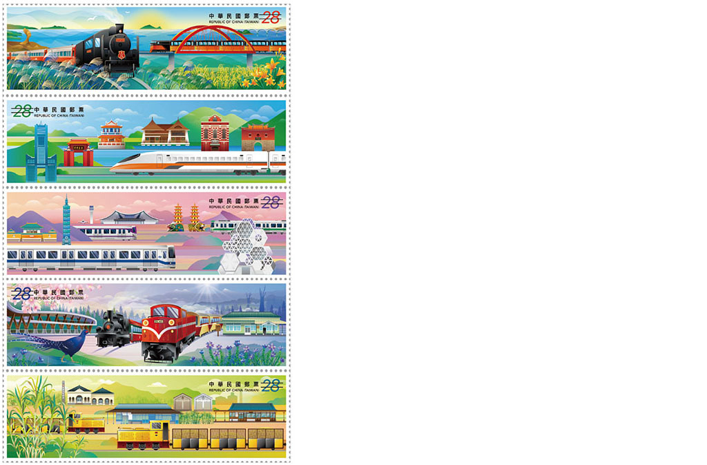 ●圖26:2024年林磐聳偕同翁永圳、潘欣苡為中華郵政規劃設計「台灣鐵道觀光郵票」,刻意採用細長條形構圖,將台鐵、高鐵、捷運、林鐵、糖鐵五種鐵道結合當地觀光旅遊景點