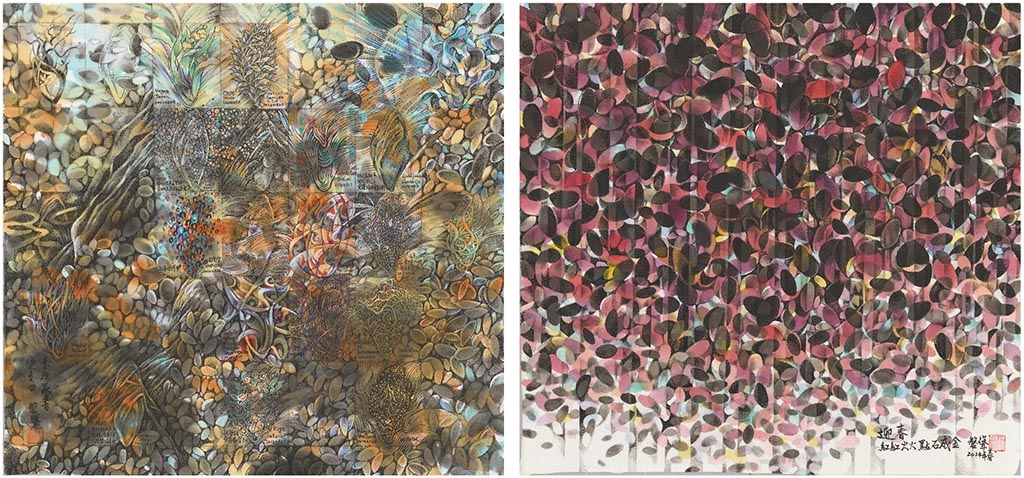 除了黑白的作品,他也嘗試水墨設色,作品一樣精采。例如〈點滴自在〉這幅作品,無數的小石頭堆疊,部分畫面為黑暗遮蓋,但仍有一處開口,陽光灑落。暗喻他畫台灣,精誠所至,金石為開。這幅畫作也有強烈的自我指涉,作品名稱暗喻作畫的過程:他在心經「觀自在菩薩」的梵唱聲中,一點一滴,持續作畫,持續修行。〈磊磊軒大地〉則以更大尺幅將千百顆石頭層層堆疊,顏色往上漸層漸淡,往下則見多層積累的厚重,退一步看則畫作脫離寫實的形體限制,只留下無數圓弧線條與色塊交錯,傳達了一種抽象的組構之美。〈台灣練習曲〉也傳達出類似的情感,只不過畫面轉為多彩的變奏,呈現飽滿的生命張力。〈薪火不息〉轉換再現的符號,從石頭到火焰,這個新的畫作,視覺效果強烈,觀者可以從閃動的火焰感受到光與熱。而〈祥雲獻瑞美麗島〉以祥雲建構台灣島,流暢的曲線,帶來生動活潑的效果,紫色的基調也傳達紫氣東來的瑞兆。(見圖30、31)