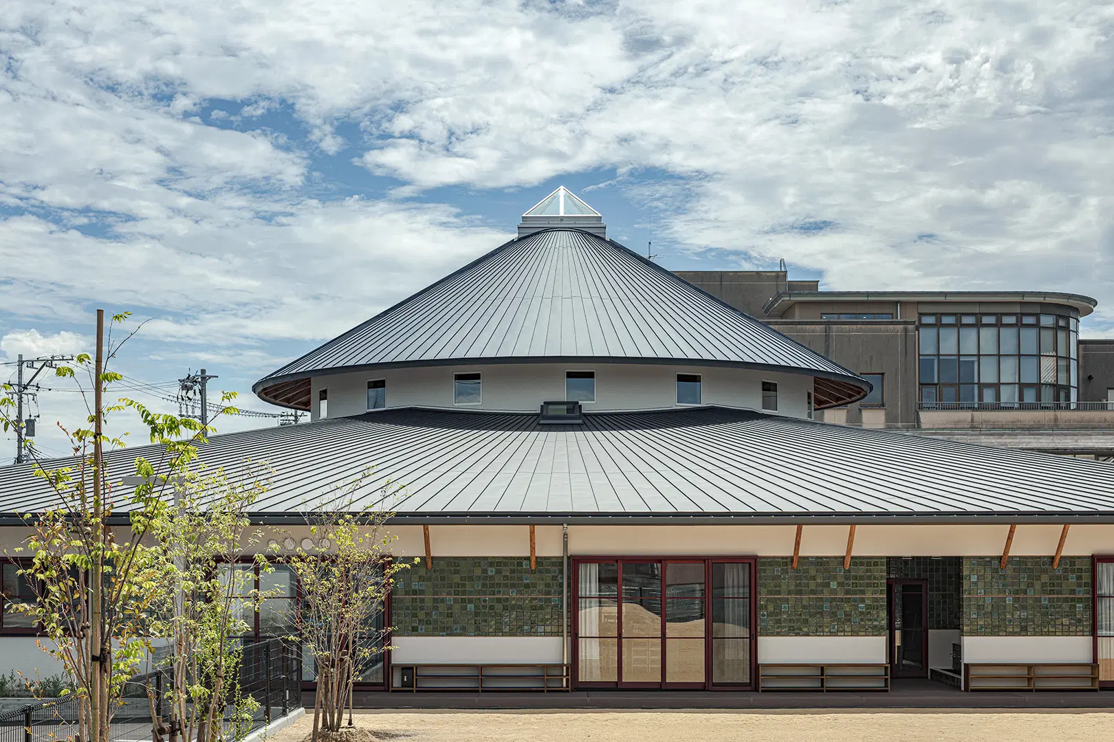 設計理念在於打造一個支持幼兒學習的教育環境,同時成為社區中具辨識度的公共地標。建築的配置受基地條件影響——基地狹長,南北向,且被既有的地下汙水管道貫穿。為因應這一限制,建築被安置於管線一側,以最佳化可用空間並確保充足自然光。托兒中心採用傳統木構架系統建造,使用在地木材,並獲得日本林業廳「地區材利用補助計畫」支持。這樣的做法不僅強化了與地方工藝的連結,也促進了地區資源的永續運用。
