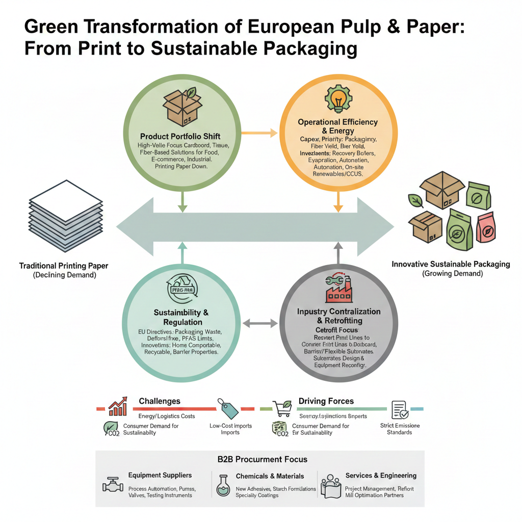 歐洲紙漿、造紙與包裝企業正加速向永續紙漿包裝和產能效率升級轉型,因傳統印刷紙需求持續下降。2025 年底的市場數據顯示,歐洲印刷紙需求疲軟,部分市場的運行率遠低於歷史水平,促使造紙廠將產能轉向高價值包裝、特殊紙種及纖維基解決方案,以維持長期獲利能力。這一轉型受到多重因素推動:能源與物流成本持續上升、低價進口競爭加劇,以及關於包裝永續性和無森林砍伐供應鏈的法規快速變化。因此,許多整合型集團正在將產品組合從大宗印刷紙轉向紙板、衛生紙及創新紙漿包裝,用於食品、電子商務和工業應用。
