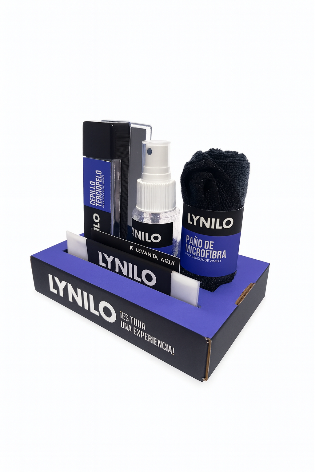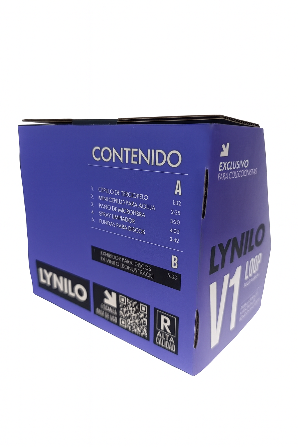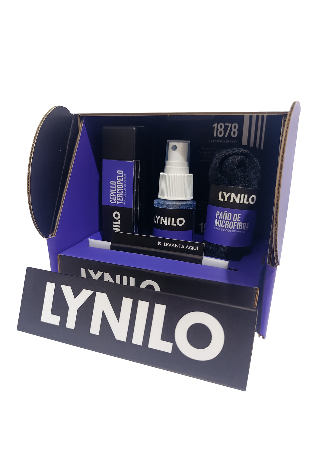 LYNILO 是一款黑膠唱片清潔組。它包含一個防靜電刷、一個唱針迷你刷、一塊超細纖維布、一瓶清潔噴霧和一個黑膠唱片保護套。這款包裝的獨特之處在於它可以變成一個展示唱片封面的支架。這樣一來,盒子就擁有了第二次用途。