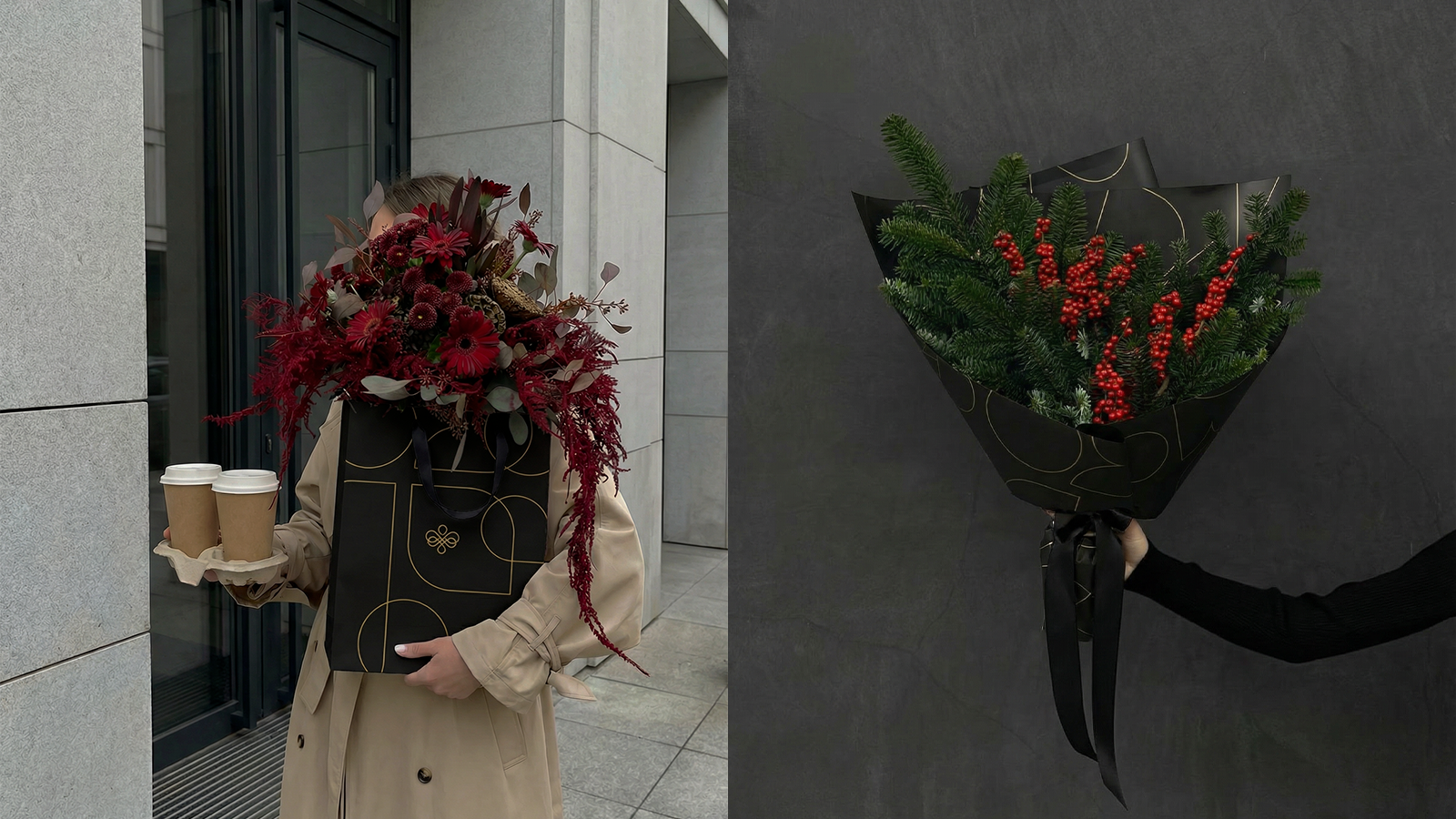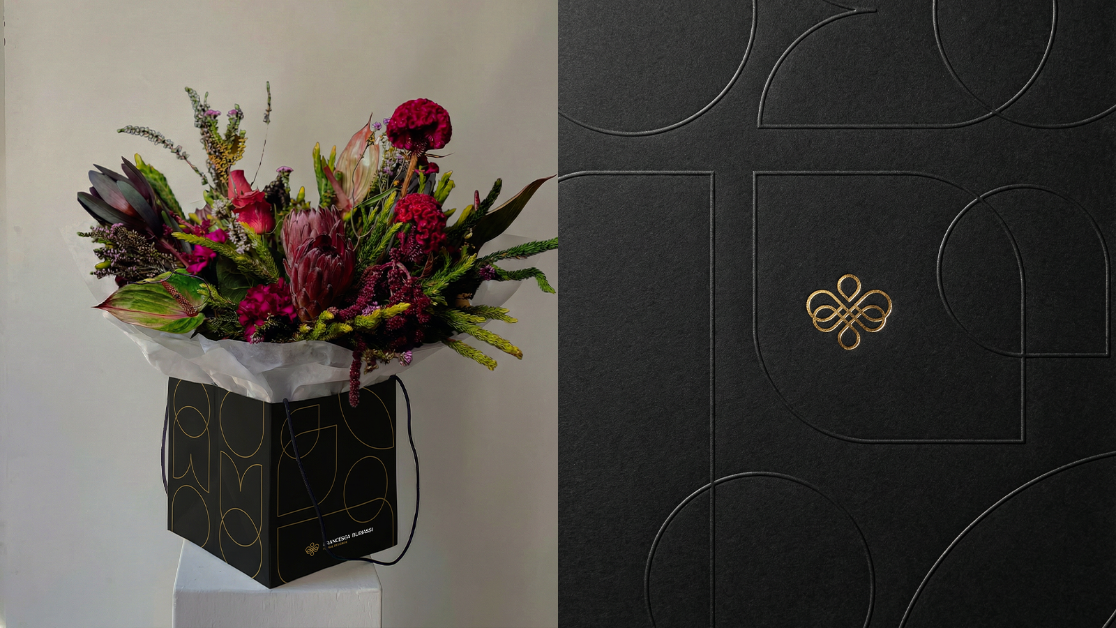 此視覺系統以霧面黑色底紋上飾以金色線條的連續幾何圖案為核心,設計成一個易於識別且模組化的元素,能夠同時適用於硬包裝和花束包裝紙。其曲線造型令人聯想到花瓣的結構和插花藝術,而燙金標誌則增添了低調優雅的氣質。