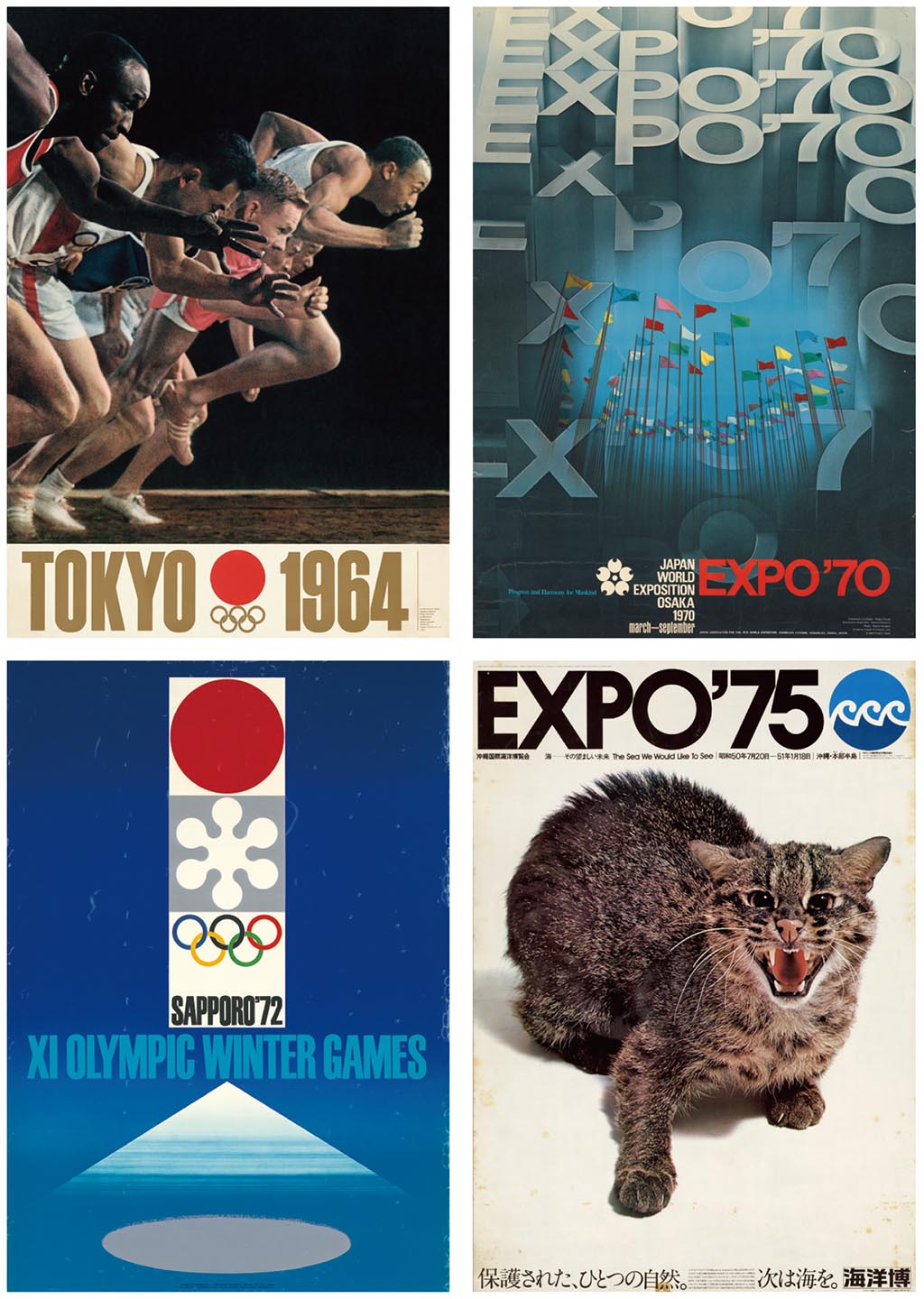 ●圖3:勝見勝率先在日本引進「Design Policy設計政策」(即現代的CIS企業識別系統)系統設計的整合模式,不僅是完成設計「物的系統性」,同時執行「事的邏輯性」,成功地建立現代奧運的設計典範,並將此典範模式轉移至1970年大阪萬國博覽會、1972年札幌冬季奧運會、1975年沖繩海洋博覽會等大型賽會活動,這套設計系統及運作模式影響到日後全球歷屆奧運會、博覽會的設計作業,真正達成「典範學習」的成功模式。左上為龜倉雄策設計1964年東京奧運會海報、右上為福田繁雄設計1970年大阪萬國博覽會海報、左下為河野鷹思設計1972年札幌冬季奧運會海報、右下為戶田正壽設計1975年沖繩海洋博覽會海報