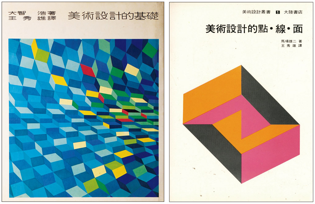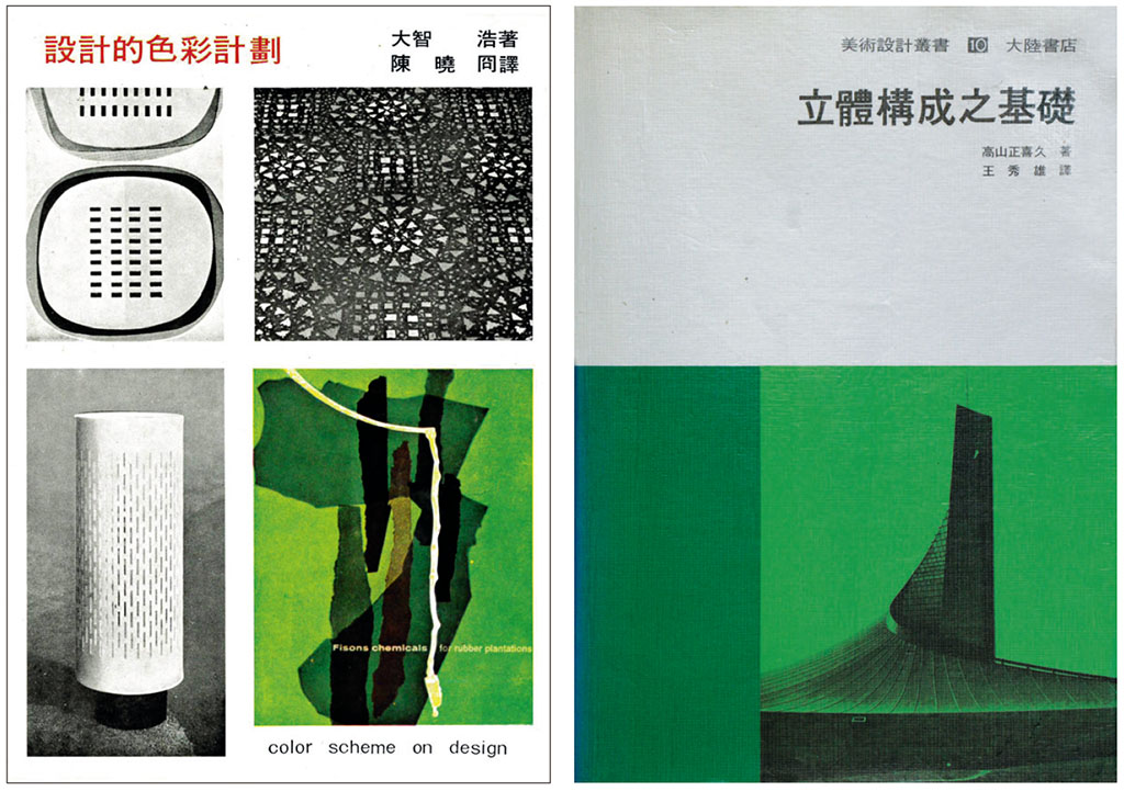 由於戰後台灣第一代出國留學者以日本居多,因此台灣早期設計資訊大多來自日本,其中大陸書店除了有出版蘇茂生翻譯大智浩、內山八郎、中丸哲夫、大智意著作《工業設計製品預想圖》,陳曉炯翻譯大智浩的《設計的色彩計畫》,曾劍峰翻譯高橋正人《平面設計的基礎》,廖偉強翻譯朝倉直巳《紙的立體構成與設計》……等,其中王秀雄(1931年~)大量的翻譯日本設計專業書籍,成為台灣設計典範學習的知識泉源;1959年王秀雄畢業於台灣省立師範學院藝術系,1965年國立東京教育大學大學院教育學科畢業、博士班肄業,1966年返台任教於台灣省立師範大學美術系,其著作《美術心理學》影響台灣藝術與設計教育極為深遠;他在1960~1970年代先後於大陸書店翻譯出版:1960年萱場修、織田博哉合著《廣告設計的技法》、1960年伊東壽太郎《設計用的素描》、1969年大智浩《美術設計的基礎》、1970年高橋正人《構成、視覺造型之基礎》、1971年馬場雄二《美術設計的點線面》、1971年約翰‧義庭《造型藝術的基礎》、1973年高山正喜久《立體構成的基礎》、1981年伊藤紀之《服飾設計的基礎》等多本設計專書。尤其是他精選了大智浩、伊東壽太郎、高橋正人、馬場雄二、高山正喜久等日本現代設計名家的專著加以翻譯,可謂從設計素描、基礎設計、廣告技法、立體構成、造型藝術、視覺心理、服飾設計等不同面向,完整地引進日本設計新知,添補了台灣設計教育與學術理論的空缺,不論這是否屬於更高層次的「典範學習」,但都為台灣的設計教育鋪墊了基礎理論。(見圖6、7)