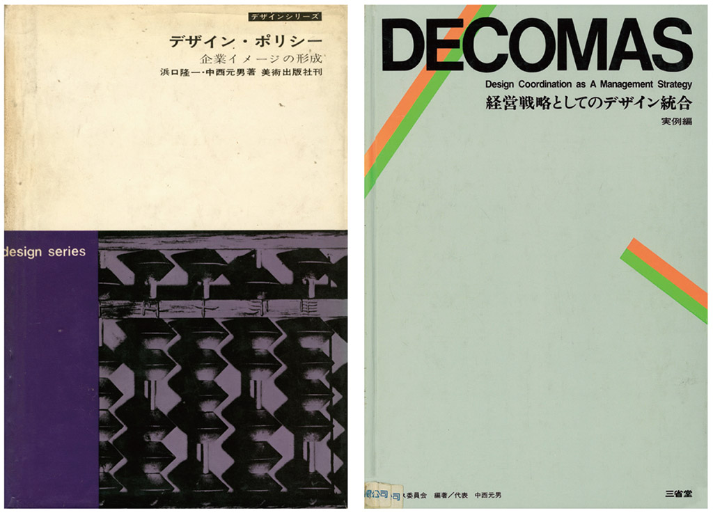 中西元男(Motoo Nakanishi,1938年出生於神戶)1959年畢業於桑澤設計研究所,1964年畢業於早稻田大學第一文學系美術專業,大學時期就發起早稻田大學設計研究會,1964年與日本建築評論家浜口隆一共同編著《デザイン‧ポリシー企業イメーヅの形成Design Policy企業形象的形成》。而在1968年成立「PAOS:Progressive Artists Open System」公司,1971年中西元男風塵僕僕地從世界各地親自蒐集歐美企業CI相關資料編著《DECOMAS:Design Coordination as a Management Strategy作為經營策略的設計整合》,奠定其在CI規劃作業的理論基礎,1980年代這套有理論篇與案例篇兩本合集的書在台灣售價新台幣6,000元,當時台灣僅有外貿協會設計推廣中心、大同大學工業設計系、廖哲夫及筆者本人少數購買此套昂貴的套書,成為台灣研究CI規劃作業的參考指標;1985年筆者編著《CIS企業識別系統》大量參考日本PAOS公司中西元男出版的《DECOMAS》就是向經典圖書學習,進而開始向中西元男所提出「亞洲型CI:MI、BI、VI」進行「典範學習」。(見圖14、15)