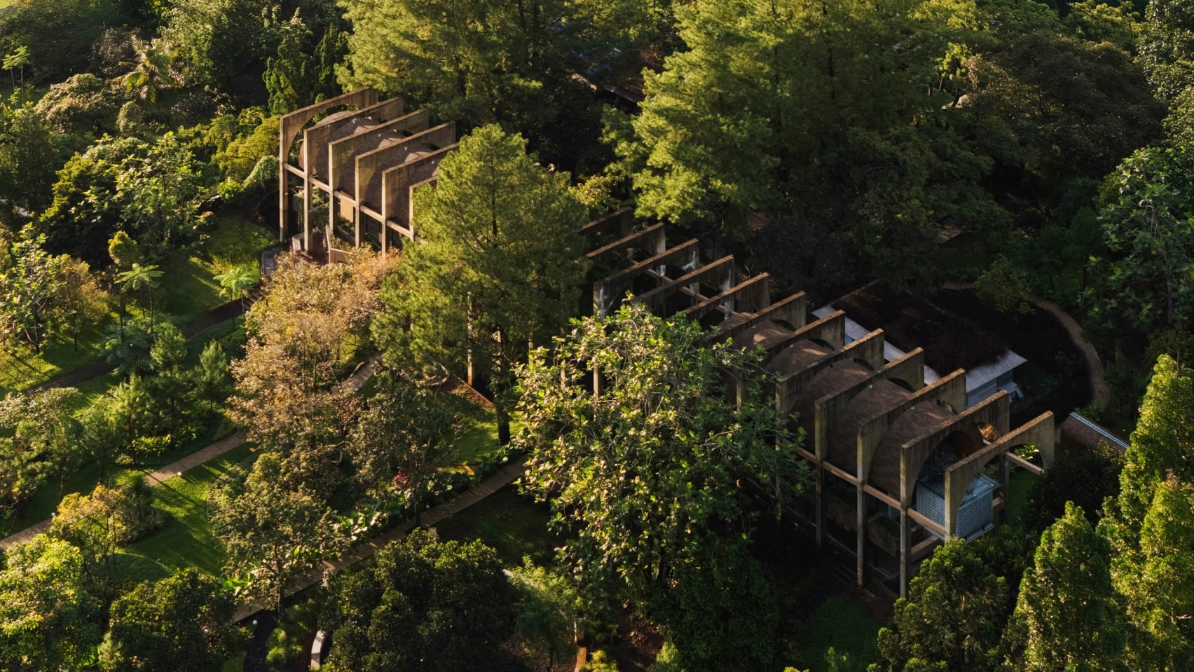 印尼建築工作室 RAD+ar 完成了聖殿隧道花園的建造,這是一座坐落在 印尼 西爪哇 混凝土 外骨骼內的宗教靜修所。 該靜修所是為私人客戶建造的,位於茂物市附近的鄉村莊園,包括別墅和“祈禱空間”,其中包括一個半公共的天主教教堂。 RAD+ar 在西爪哇完成了一次宗教靜修 休憩場所坐落在一條由融合了現代主義影響的混凝土拱門構成的隧道內。 這些拱門長約 100 米,建在斜坡的陡峭輪廓上,充當了建築群不同空間之間的橋樑。 隱居處坐落在混凝土外骨骼內 RAD+ar 首席建築師兼董事總經理 Antonius Richard表示:“樓層越高,空間就越私密。當你移至較低樓層時,教堂內的空間就變成了半公共空間,而在底層則完全開放。” 在山頂上,主別墅和客用別墅被設計成一個“祈禱和反思的天堂”,可以俯瞰森林。 一系列混凝土拱門構成了隧道狀結構 遊客還可以漫步在聖母瑪利亞精神花園中,花園周圍環繞著參天大樹,蜿蜒的小路旨在促進與大自然更深層的聯繫。 建築群的底部是小教堂,除了懸掛在空間中、被柔和的燈光照亮的耶穌大雕像外,教堂沒有任何裝飾。 理查德說:“漂浮的耶穌聖體是這一發展項目中真理和希望的象徵,從場地的另一端甚至在隧道後方 100 米處都可以看到。” Sanctuary Tunnel Garden 建在一片大森林的一個小角落裡,其簡約的結構和全玻璃牆經過精心設計,讓大自然融入其中,使建築與周圍的森林融為一體。 一樓設有小教堂 理查德說:“裸露的混凝土外骨骼的設計是為了隨著森林的苔蘚和濕度而老化。” “別墅和教堂都漂浮在場地內,屋頂上覆蓋著瓦片,以保護居住空間免受原始森林惡劣條件的影響。” 上層包含更多私人區域 一樓有一個較小的神聖空間,兩端與水體相連。梯田與人造瀑布融為一體,營造出「室內外體驗」。 聖堂隧道花園計畫面臨的挑戰之一是,由於氣候降雨量大,傾斜的場地會在山頂形成巨大的瀑布。 為了解決這個問題,RAD+ar 建造了一個廣泛的隱藏下水道系統,將所有沉重的水負荷引導回地面。 設計融入了現代主義的影響 RAD+ar 是一家印尼建築工作室,由 Antonius Richard 於 2017 年創立。 其他近期項目包括雅加達的 Aruma 餐廳和酒吧以及Frame Garden,旨在幫助當地社區更好地利用被忽視的公園。 攝影:  Ernest Theofilus。   內容來源: https://www.dezeen.com/