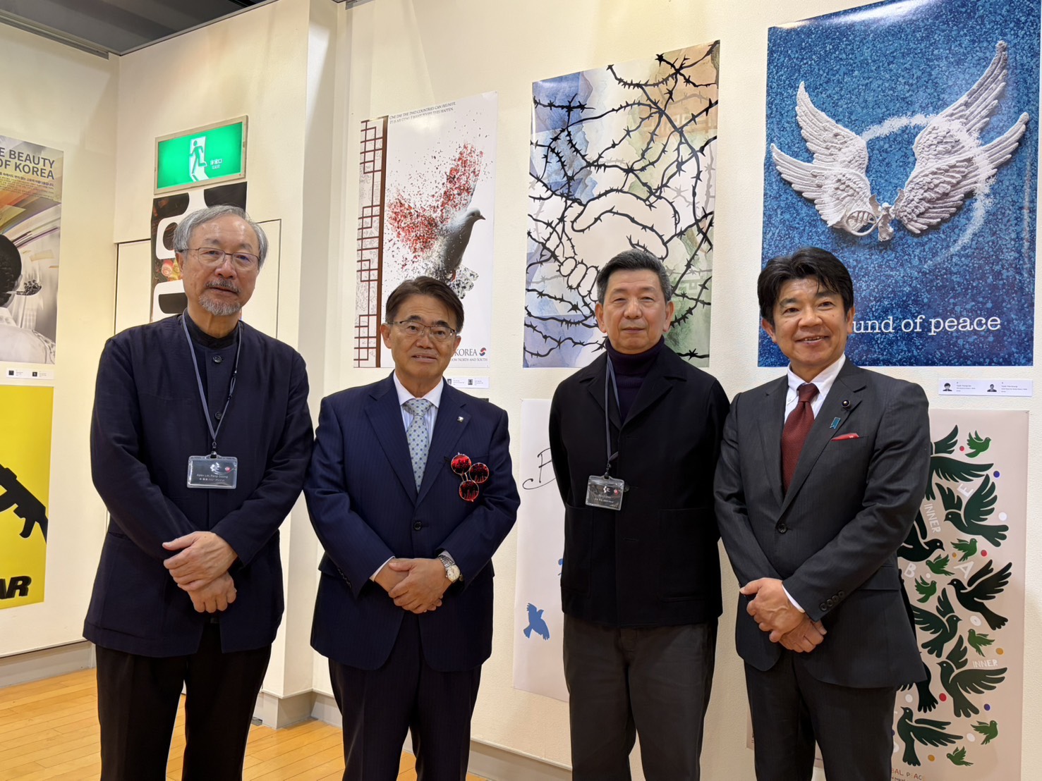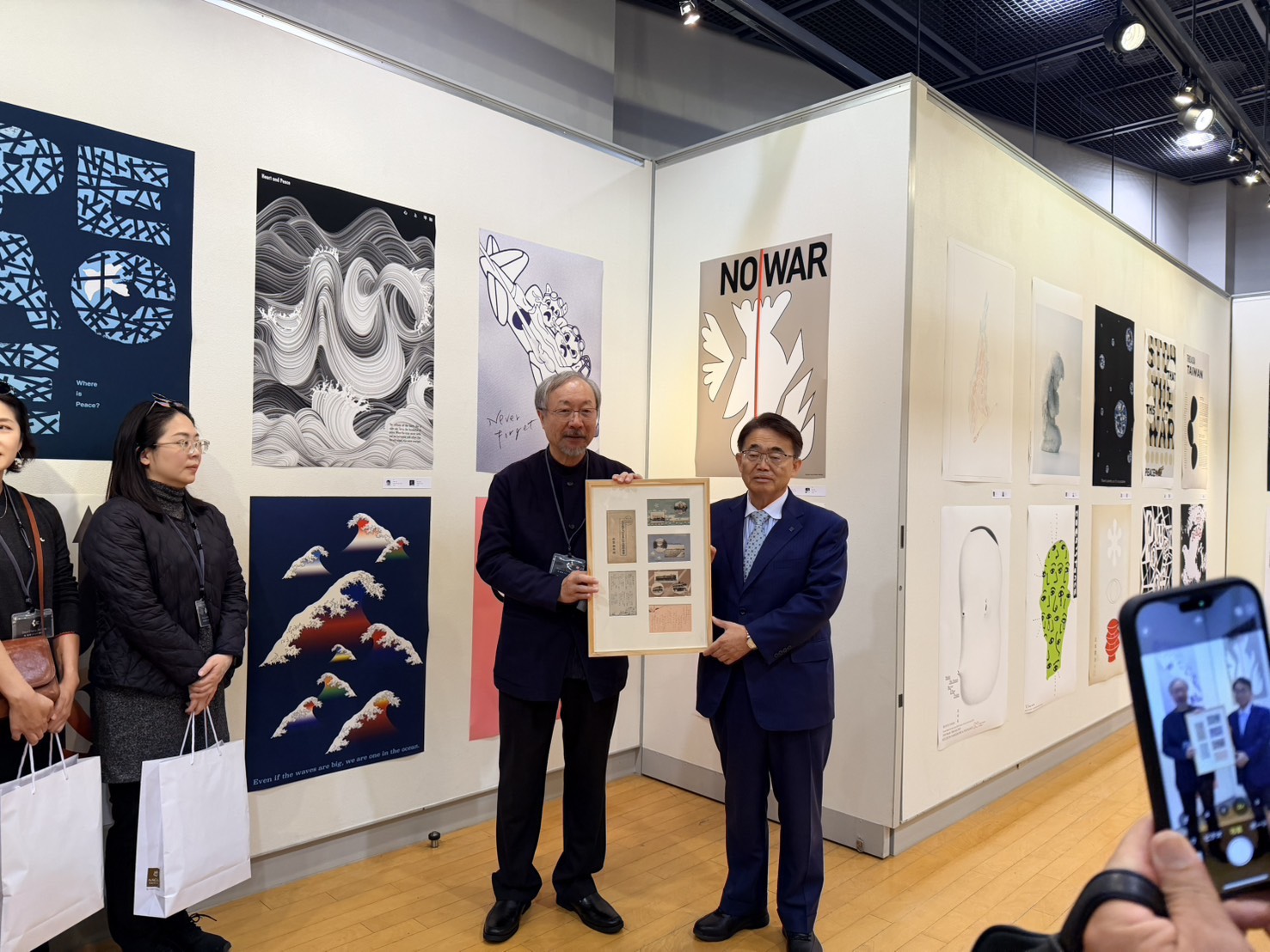 2025年12月14日---Trio Asia亞洲三重奏和平海報巡迴展在日本IdcN名古屋國際設計中心開幕典禮,林磐聳教授特別購買三隻眼睛的墨鏡,一來跟本次亞洲三重奏展覽海報的主視覺造型相互呼應;二來是象徵設計師除了一般人的兩隻眼以外,還有第三隻的天眼。不只讓整個活動更加充滿創意與樂趣;受邀前來致詞的愛知縣知事(縣長)也很高興跟我們一起玩著戴上三隻眼的墨鏡,最後還帶回去紀念。