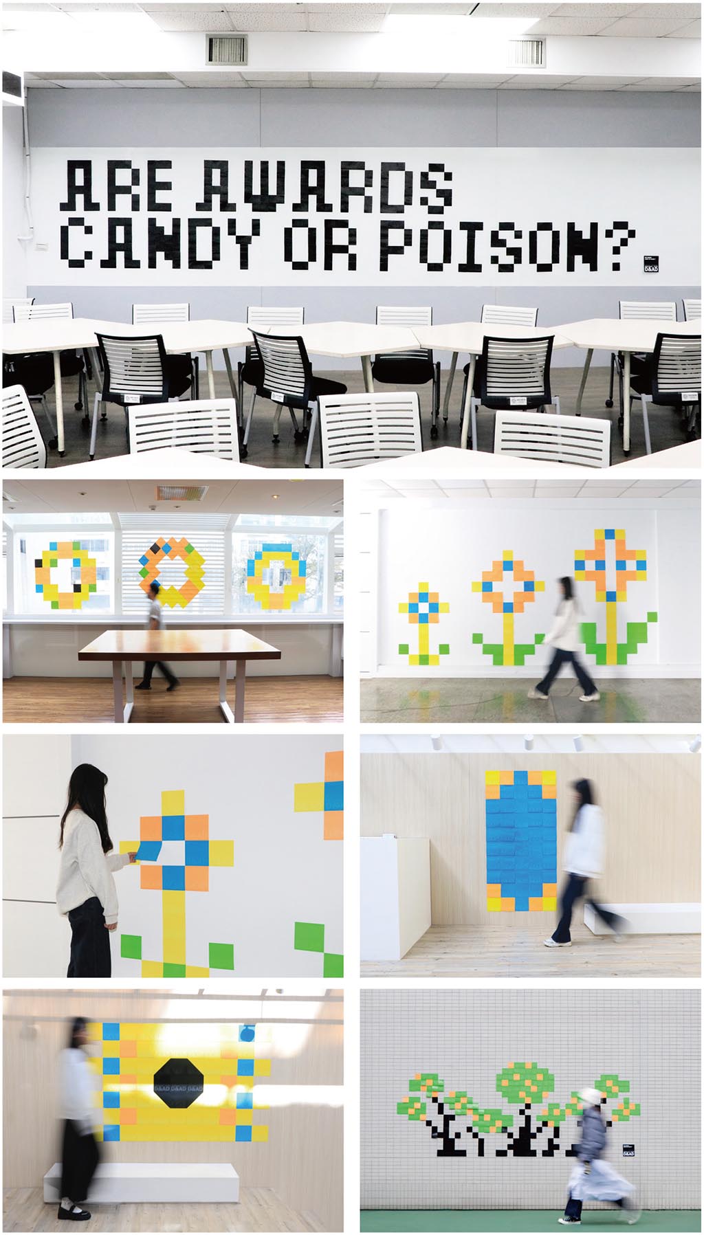 在此次展覽的宣傳中,筆者希望以開放的方式鼓勵學生設計師從不同角度解讀這一主題。在海報設計上,筆者從十多年前的這個想法中得到了靈感,並將其與此次展覽的主題相結合-「獎項是糖果還是毒藥?」這個帶有哲學意味的提問,旨在激發參與者的反思。參與者,無論是研究生還是設計師,都被邀請利用已印有展覽資訊的16×16公分小卡片,作為回應主題的元素。透過他們的創意思維,將這些小卡片拼貼成圖案,並將其張貼於校園牆面上。每一個作品旁邊都有標註展覽資訊,以及參與的學生設計師對於這個問題的創作說明。在這樣的呈現中,這些作品不僅成為策展內容的一部分,也成為英國D&AD展覽海報的視覺延伸,並與校園環境視覺相結合,帶來不同層次的思考與互動。