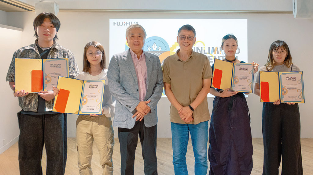 ●獲獎者合影留念,一同見證精彩時刻,左起依序為學生組優選吳政昂、學生組優選林資穎、台灣富士軟片資訊董事長勝田明典、清流影像總經理劉信言、學生組第一名林品妍、學生組第二名邱郁晴