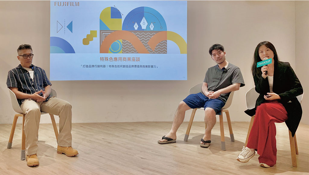 ●座談會活動合影,左起為凱西比設計創辦人George、卵形設計工作室負責人葉忠宜,以及主持人台灣富士軟片資訊公司數位印刷事業處產品行銷部經理簡瑄