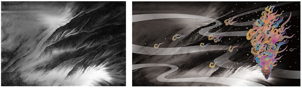 除了黑白的作品,他也嘗試水墨設色,作品一樣精采。例如〈點滴自在〉這幅作品,無數的小石頭堆疊,部分畫面為黑暗遮蓋,但仍有一處開口,陽光灑落。暗喻他畫台灣,精誠所至,金石為開。這幅畫作也有強烈的自我指涉,作品名稱暗喻作畫的過程:他在心經「觀自在菩薩」的梵唱聲中,一點一滴,持續作畫,持續修行。〈磊磊軒大地〉則以更大尺幅將千百顆石頭層層堆疊,顏色往上漸層漸淡,往下則見多層積累的厚重,退一步看則畫作脫離寫實的形體限制,只留下無數圓弧線條與色塊交錯,傳達了一種抽象的組構之美。〈台灣練習曲〉也傳達出類似的情感,只不過畫面轉為多彩的變奏,呈現飽滿的生命張力。〈薪火不息〉轉換再現的符號,從石頭到火焰,這個新的畫作,視覺效果強烈,觀者可以從閃動的火焰感受到光與熱。而〈祥雲獻瑞美麗島〉以祥雲建構台灣島,流暢的曲線,帶來生動活潑的效果,紫色的基調也傳達紫氣東來的瑞兆。(見圖30、31)