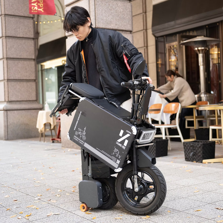 這款名為 Icoma Tatamel Bike 的電動機車,可以折疊到如同登機箱般的尺寸。