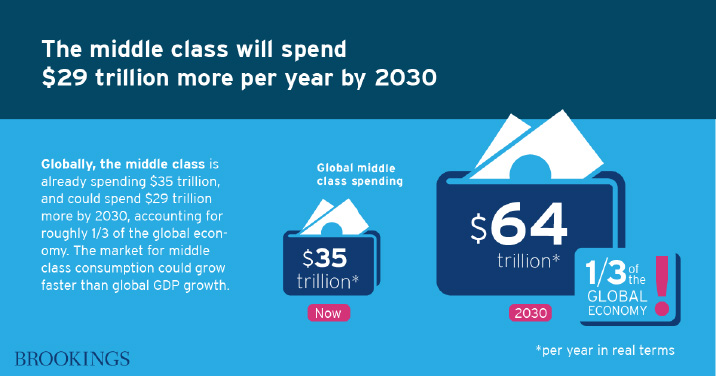 目前市場面臨不少逆風,但歷史告訴我們,這些挑戰終將過去。只要經濟持續成長,印刷尤其是包裝印刷仍會持續增長。過去十年,消費主義呈現空前擴張,目前全球消費年增長約 35 兆美元,預計到 2030 年將達約 64 兆美元(根據布魯金斯研究)。這一增長由全球中產階級擴張驅動,約占全球經濟的三分之一。