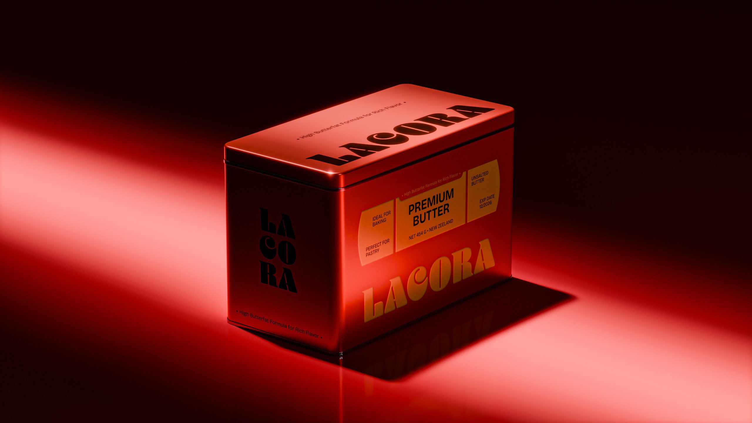 LACORA 的包裝設計也呼應產品理念。方形錫盒搭配大膽字體,展現自信、清晰與現代感;同時確保奶油的新鮮度。從色塊搭配到簡潔文字,每一個設計細節都刻意安排,讓產品以品質說話,而非依靠裝飾炫耀。