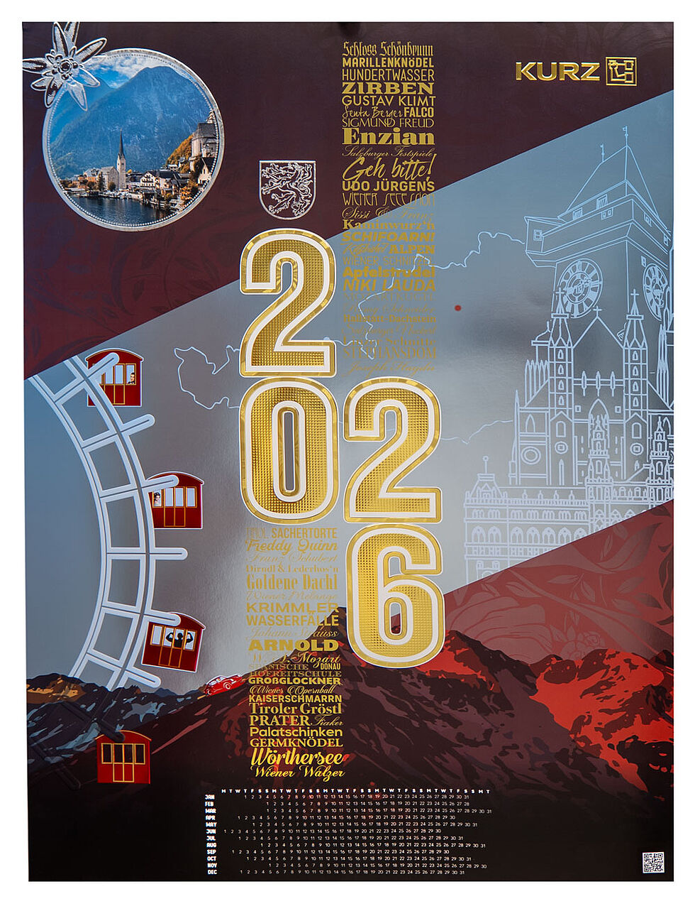 這款 A1 尺寸的收藏級掛曆,以奧地利的文化地標與自然景觀為主題,從維也納摩天輪到阿爾卑斯山景與哈修塔特(Hallstatt),透過冷轉印、燙金與盲壓的多層次工藝,呈現在 Algro Design Duo 250 g/m² 紙材上。最終成果質感豐富、層次鮮明,散發明確的高端氣息。