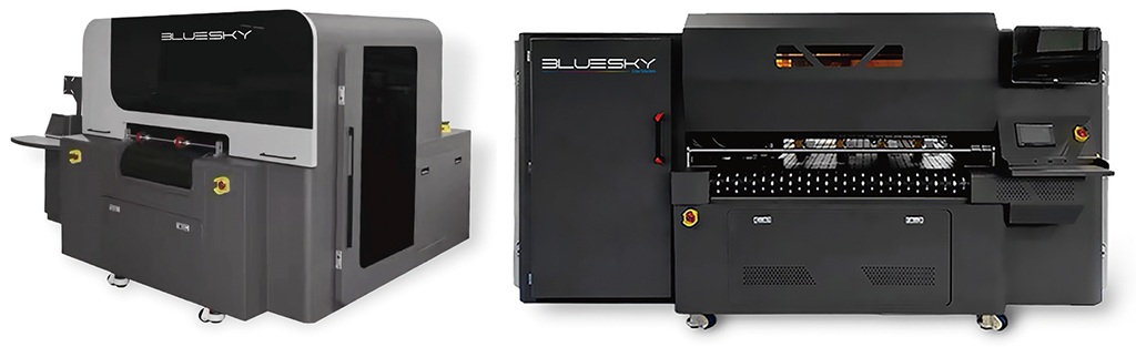 ●(左圖)BlueSky Single Pass工業級UV數位印刷機,其印刷精度高,彩色自帶光油效果,也可印製白墨