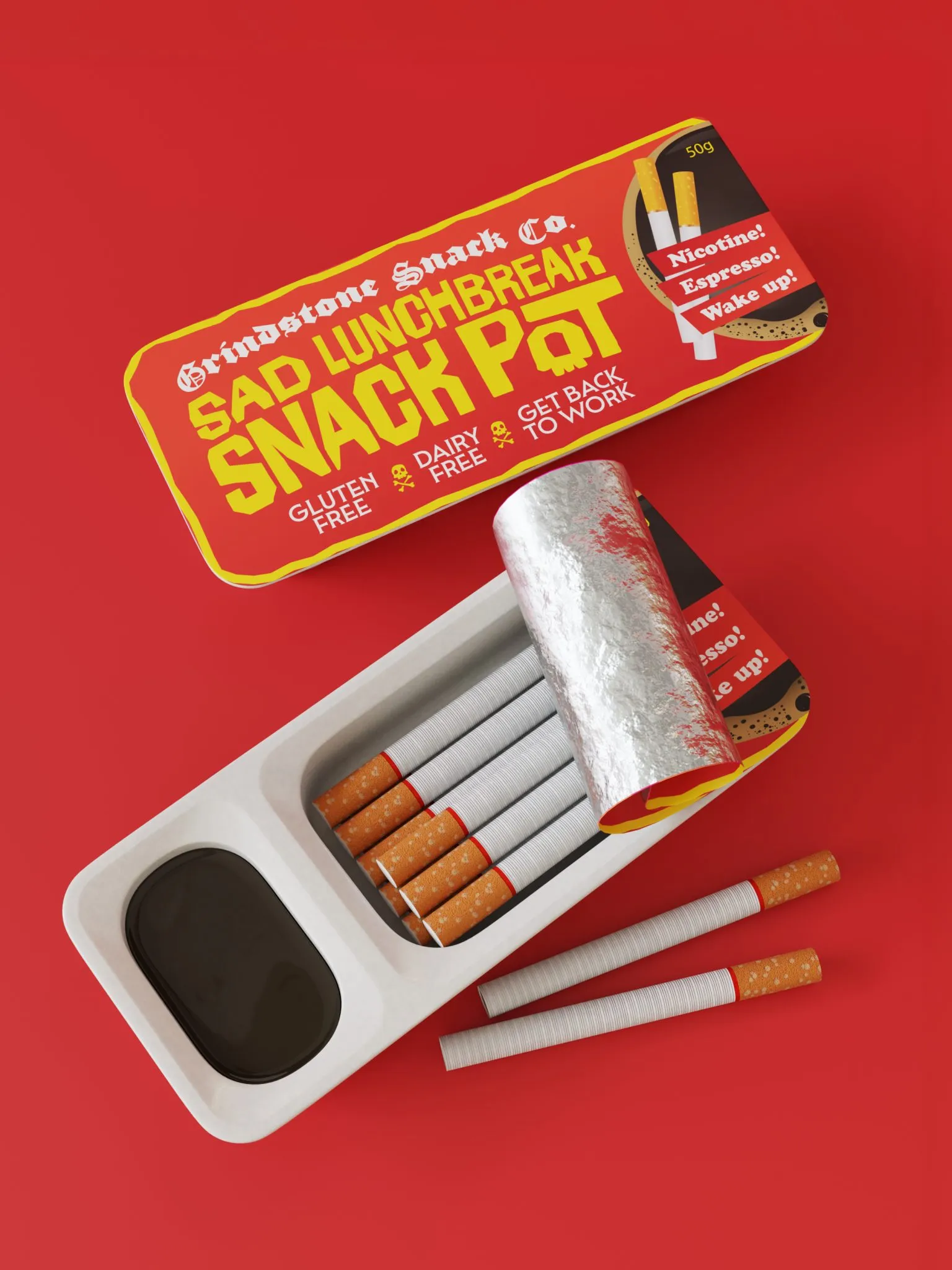 由 OwtCanny 設計,這款包裝充滿誇張、幽默且自覺的表現,內容包含香菸與黑咖啡,且完全無麩質、無乳製品。鮮紅與黃色的配色、鋸齒狀線條、幾乎在表面「跳動」的字體,都呼應了裡面尼古丁與咖啡因混亂的氛圍。