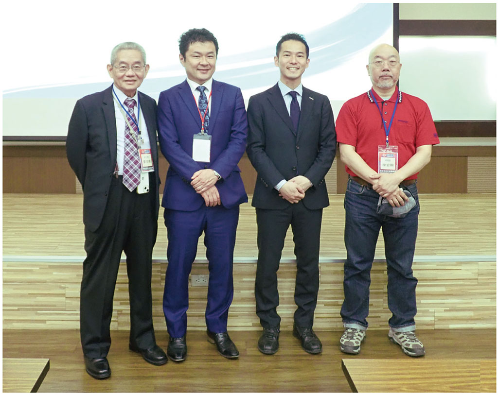 ●聯誼會展場合影,左起本源興公司董事長廖本全、Best Pack Co., Ltd.部長薗边良平、日本旭化成株式會社課長志水悟、日文翻譯特助廖宜興