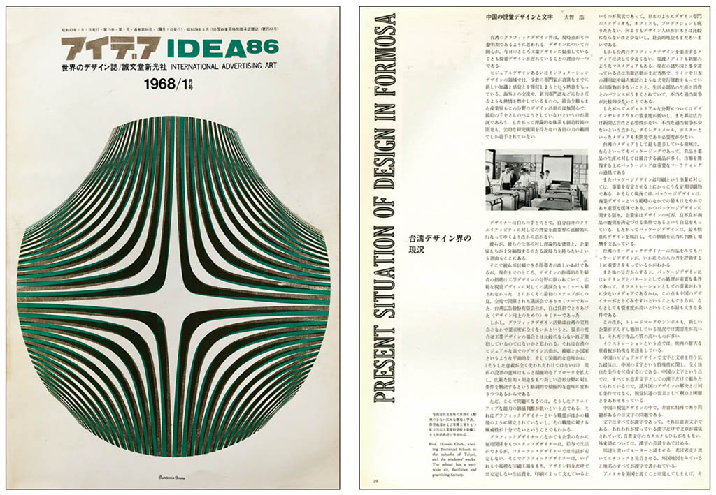 ●(左)圖12:1968年1月號《IDEAアイデア》雜誌由台灣設計師蕭松根封面設計,特別報導「台灣設計」專題,其中除了大智浩撰寫〈中國之視覺設計和文字〉,施翠峰撰寫〈台灣設計教育之現況〉,大智浩可謂是將台灣設計首度推廣至國外專業設計雜誌的推手