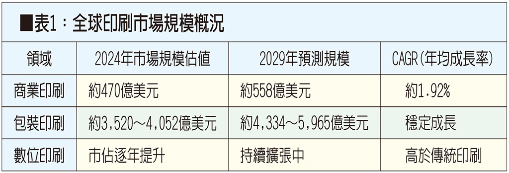 2024年全球印刷市場規模預估值,商業印刷約470億美元,包裝印刷約3,520~4,052億,而數位印刷的市佔率則逐年提升。2029年全球印刷市場預測規模,商業印刷約558億美元,包裝印刷約4,334~5,965億美元,數位印刷持續擴張中。(見表1)