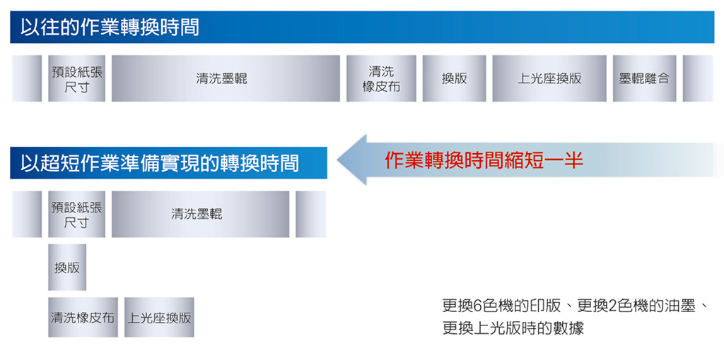 接下來要介紹幾項有助於縮短非生產時間的技術,透過有效地降低非生產時間,客戶能夠進一步提升設備的運轉效率,並在有限的機器稼動時間內,創造出更高的產能。而在包裝印刷業務當中,佔非生產時間比率最大的就是「作業轉換」。