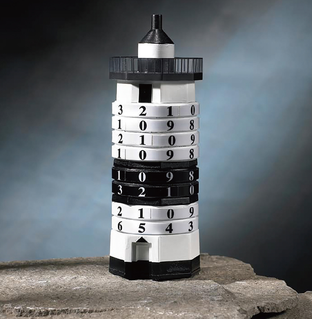 台灣新北市石門海邊有一座著名的地標「富貴角燈塔」,筆者用復刻版的方式打造成一個桌上型立體萬年曆,類似早期的日曆,一天轉一次和燈塔建立了親密關係,故事描述時空與人的溫度,狂風與海浪結盟,以滴水穿石的堅持啃蝕出龍洞,山頂上幾支大型風輪隨興共舞,鳴唱著一回又一回的圓舞曲,幾枚單線風箏從北方趕來湊熱鬧,以飛天之姿和著節奏,富基漁港中漁船正滿載回航,海龍王的獻禮一船船驚喜,海岸上黑白相間的富貴角燈塔睜大眼見證,日日月月分分秒秒痴心守候,每位出現在北海時間軸上的過客!(見圖48)