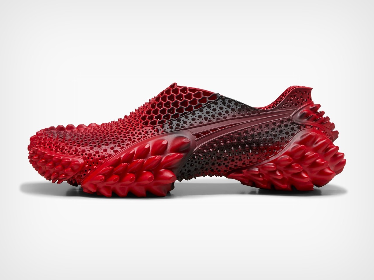 Mostro 3.D 的魅力核心在於其對 3D 列印技術的突破性使用。該鞋採用先進的樹脂工藝製成,並擁有傳統方法無法達到的複雜程度。這項創新轉化為引人注目的細節輪廓,充滿大膽的尖刺,呼應未來派、幾乎超凡脫俗的存在。時尚的一腳蹬設計不僅方便,而且是一種反抗規範的美學宣言。透過細緻的噴槍技術實現的黑色和紅色漸變,成為動態畫布,捕捉運動和變換的本質。在這裡,科技與藝術和諧共存,相互推動,創造出真正具有變革性的東西。