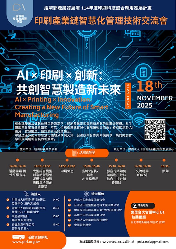 財團法人印刷創新科技研究發展中心預定於114年11月18日(二)13:30假集思台大會議中心B1拉斐爾廳 (106台北市大安區羅斯福路四段85號B1) 舉辦「印刷產業鏈智慧化管理技術」交流會,本活動免費參與,竭誠歡迎大家蒞臨!!