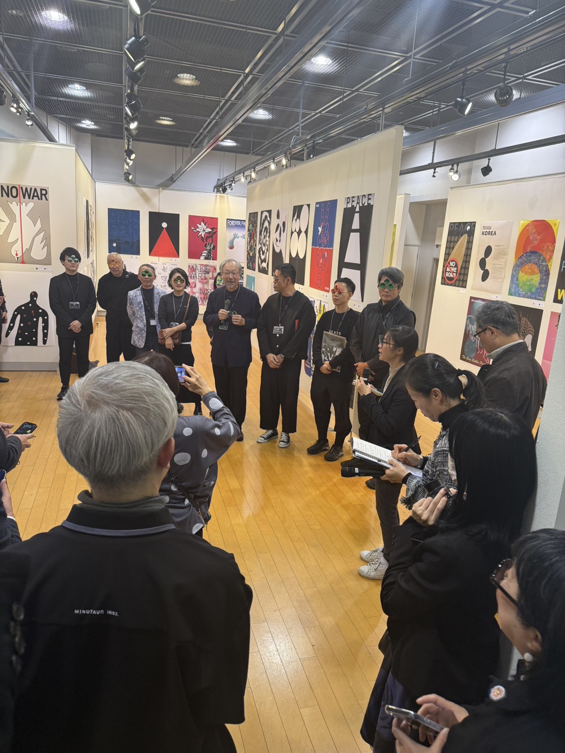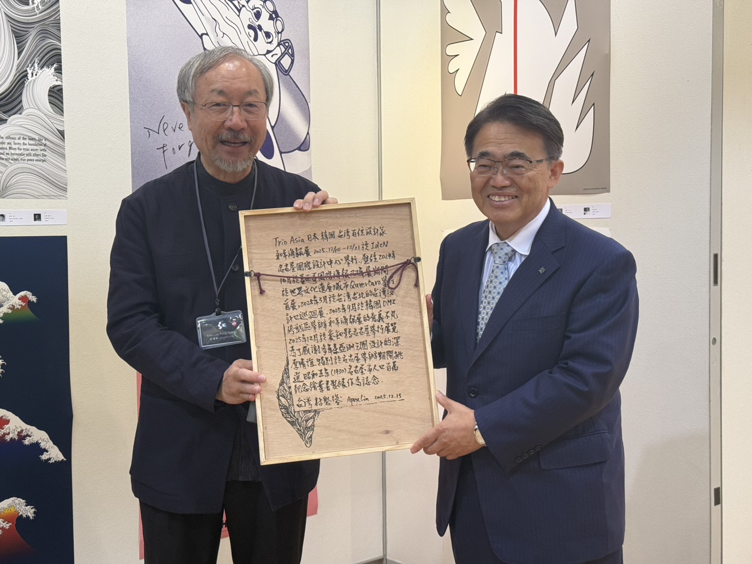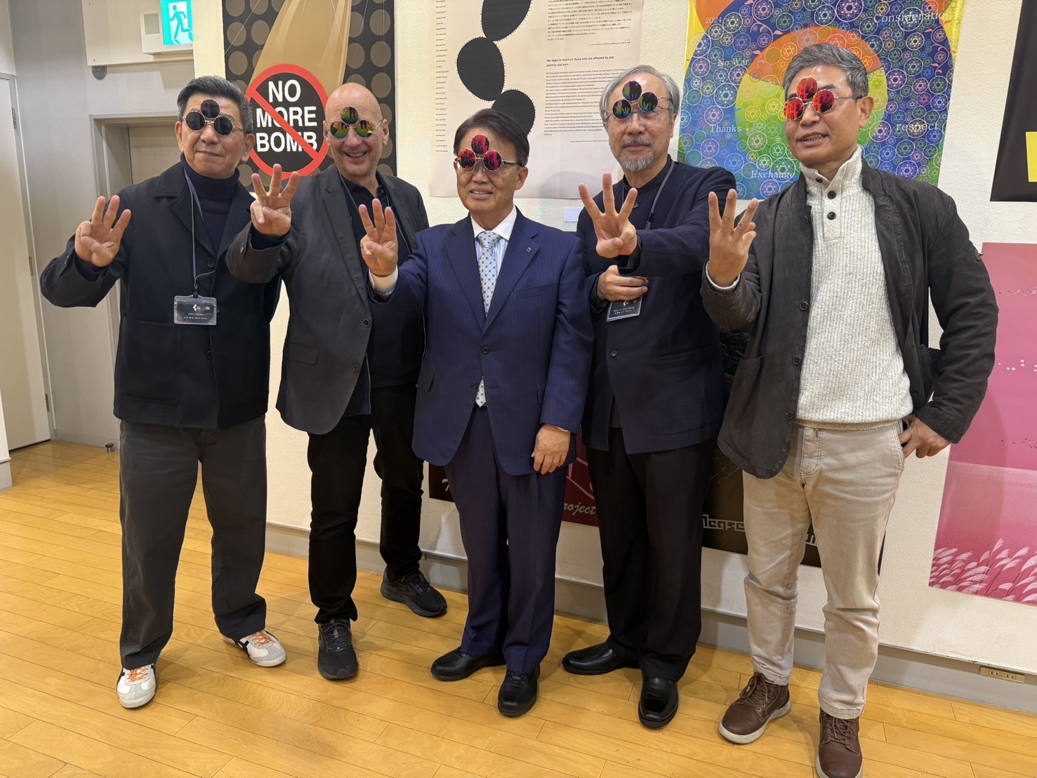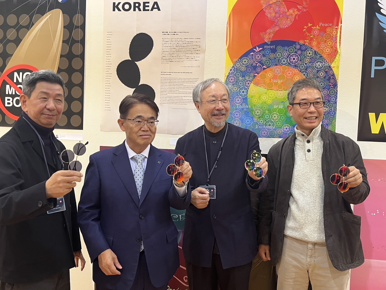 2025年12月14日---Trio Asia亞洲三重奏和平海報巡迴展在日本IdcN名古屋國際設計中心開幕典禮,林磐聳教授特別購買三隻眼睛的墨鏡,一來跟本次亞洲三重奏展覽海報的主視覺造型相互呼應;二來是象徵設計師除了一般人的兩隻眼以外,還有第三隻的天眼。不只讓整個活動更加充滿創意與樂趣;受邀前來致詞的愛知縣知事(縣長)也很高興跟我們一起玩著戴上三隻眼的墨鏡,最後還帶回去紀念。